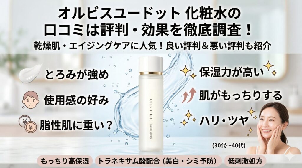 リード文 この記事では、オルビスユードット 化粧水の口コミについて詳しく解説します。結論から言うと、オルビスユードット 化粧水は「保湿力が高い」「肌がもっちりする」といった口コミが多く、乾燥肌の方やエイジングケアを始めたい方から高い評価を得... -