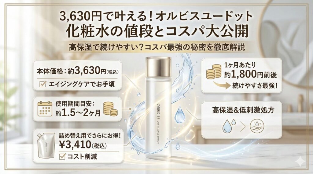 リード文 この記事では、オルビスユードット 化粧水の値段について詳しく解説します。結論から言うと、オルビスユードット 化粧水は約3,630円とエイジングケア化粧水の中では手頃な価格で、コスパの良さが魅力です。約1.5〜2ヶ月使えるため月あたりの負担... -