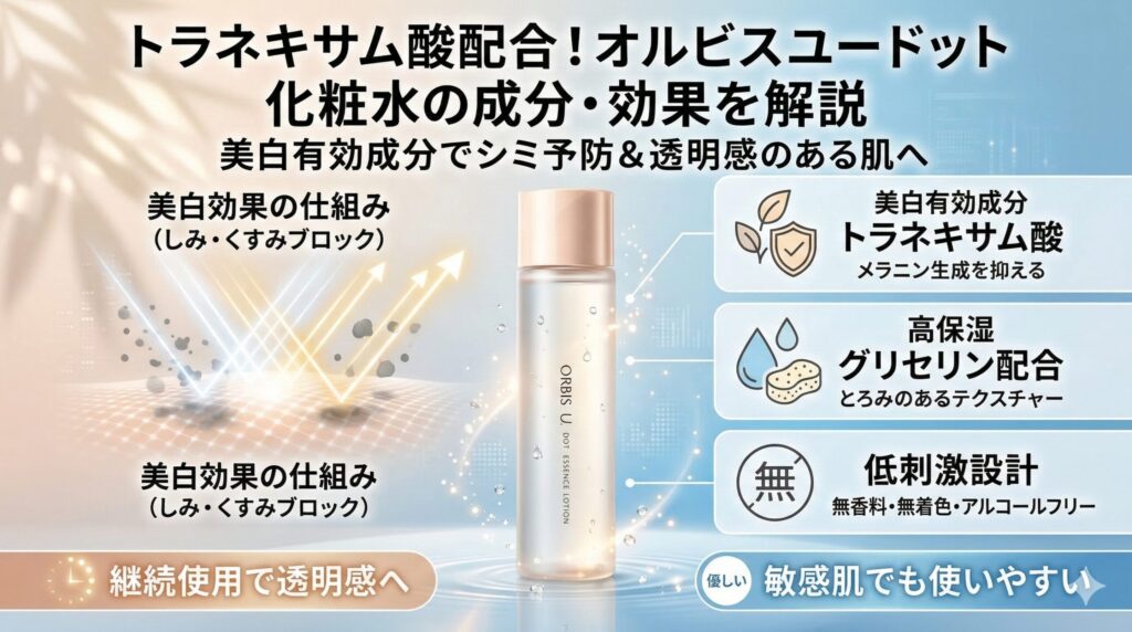 リード文 この記事では、オルビスユードット 化粧水に配合されているトラネキサム酸とは何か、成分や効果についてわかりやすく解説します。結論として、トラネキサム酸はシミやくすみの原因にアプローチする美白有効成分で、継続使用によって透明感のある...
