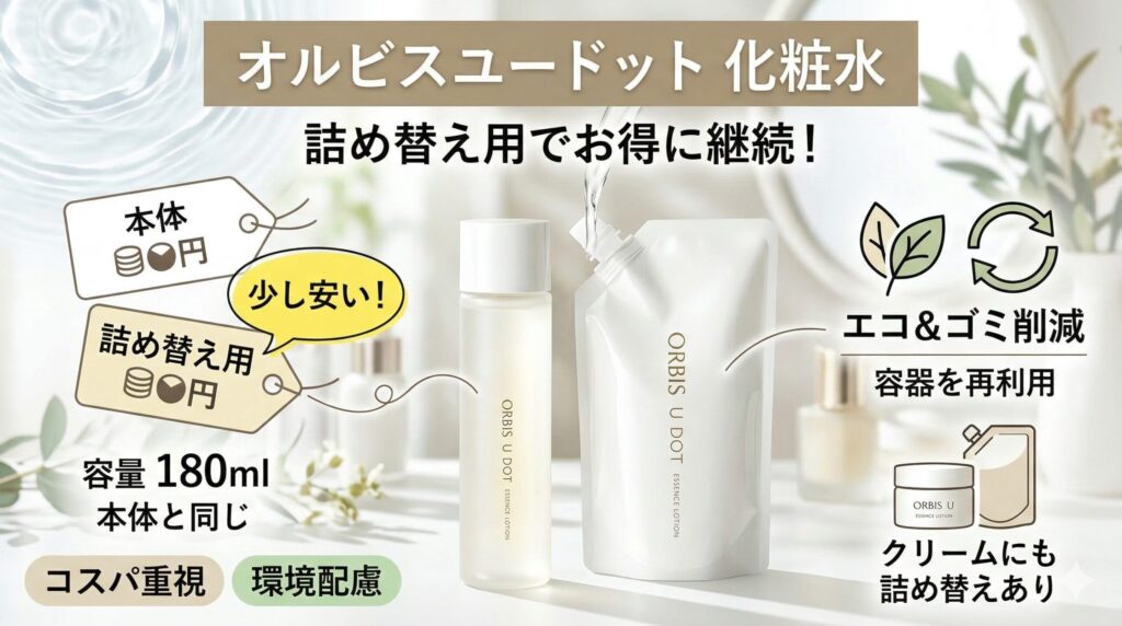 リード文 この記事では、オルビスユードット 化粧水の詰め替えについて解説します。結論から言うと、オルビスユードット 化粧水には詰め替え用があり、本体より少し安い価格で購入できます。容量は本体と同じ180mlで、容器を再利用できるためコストを抑え... -