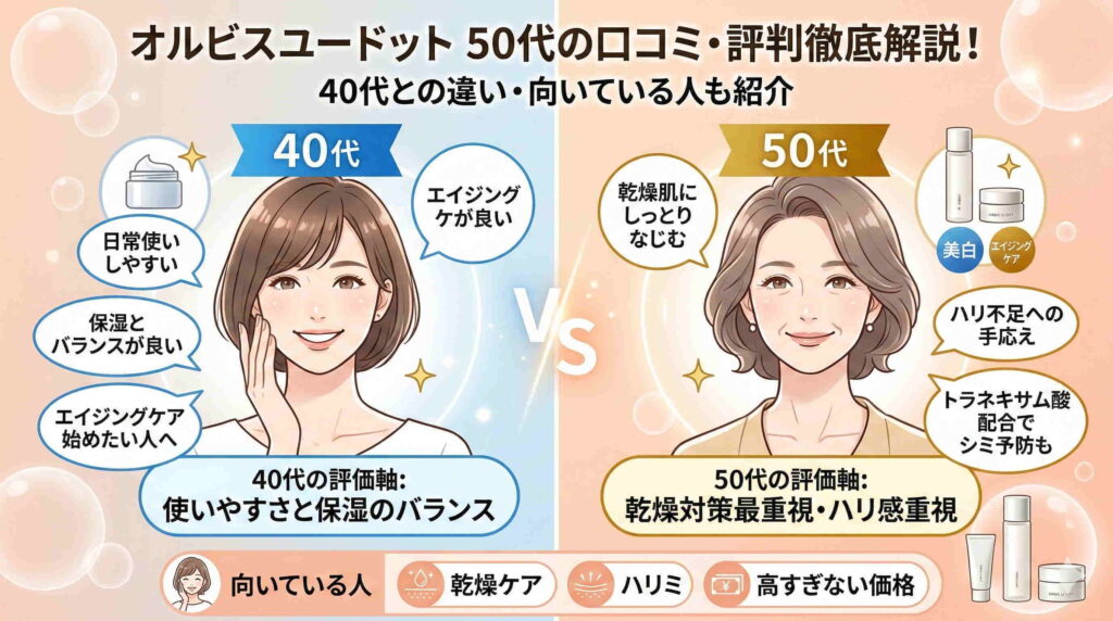 リード文 この記事では、オルビスユードットの口コミは50代でどうなのか、40代との評判の違いもあわせて解説します。結論から言うと、オルビスユードットは50代の乾燥しやすい肌にも取り入れやすく、しっとり感やハリ不足へのケアを重視したい方から評価さ... -