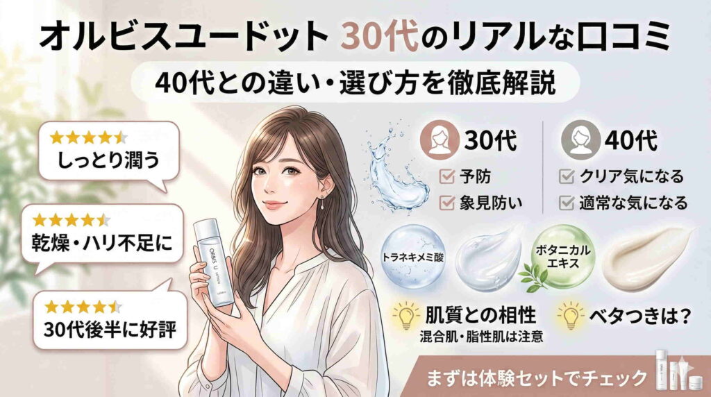 リード文 この記事では、オルビスユードットの30代口コミをもとに、40代との違いや選び方をわかりやすく解説します。結論として、オルビスユードットは30代全員に向くわけではありませんが、乾燥やくすみ、ハリ不足が気になり始めた30代後半には取り入れや...