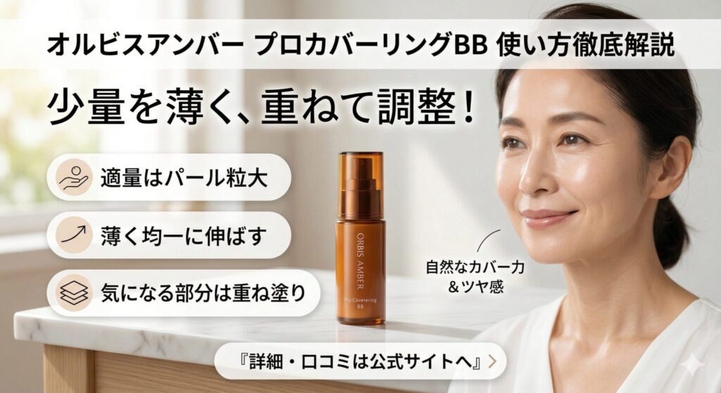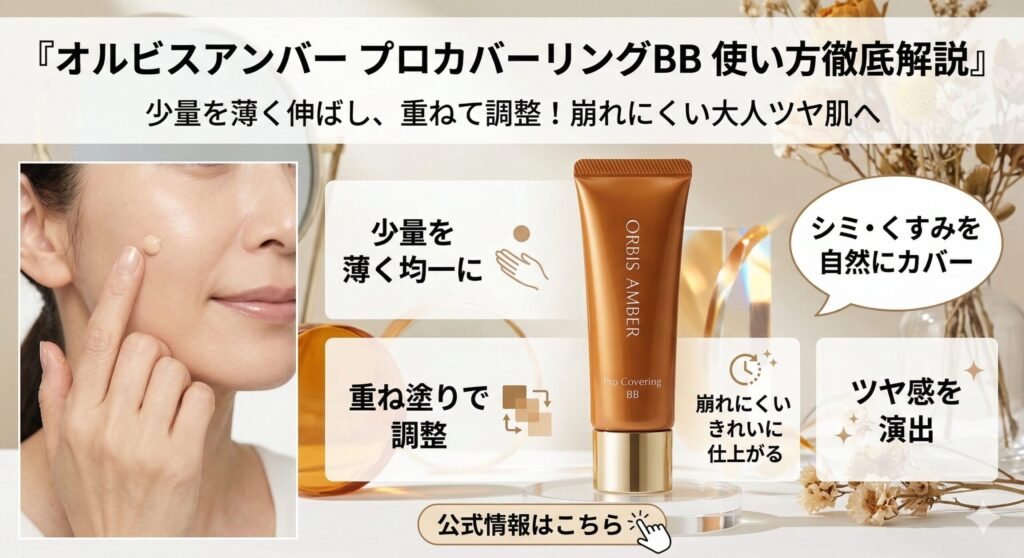 リード文 この記事では、オルビスアンバープロカバーリングBBの使い方をわかりやすく解説します。結論から言うと、少量を薄く均一に伸ばし、重ね塗りで調整することが崩れにくくきれいに仕上げるポイントです。年齢肌を意識した設計で、シミやくすみを自然... -
