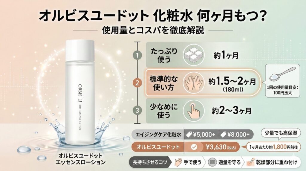 リード文 この記事では、オルビスユードット 化粧水が何ヶ月持つのか、使用量やコスパについてわかりやすく解説します。結論として、標準的な使い方で約1.5〜2ヶ月持ち、使い方によっては1〜3ヶ月程度と幅があります。適量を守りながら使えば、エイジング... -