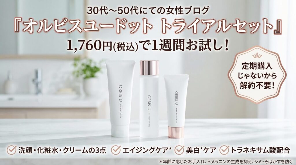 リード文 この記事では、オルビスユードット トライアルが本当にお得なのか、セット内容や購入条件について詳しく解説します。結論から言うと、トライアルセットは税込1,760円前後で、洗顔・化粧水・クリームを約1週間ライン使いできるお試しセットです。... -