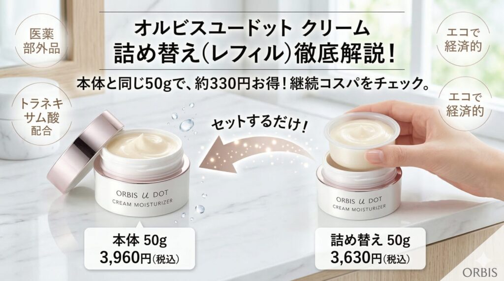 リード文 この記事では、オルビスユードットクリームモイスチャライザーの詰め替えについて詳しく解説します。結論から言うと、詰め替えは販売されており、本体より少し安く購入できます。本体と容量は同じ50gですが価格差があり、継続して使う場合はコス... -