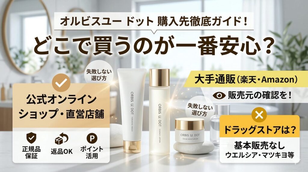 リード文 この記事では、オルビスユー ドットはどこで購入できるのかをわかりやすく解説します。結論から言うと、公式オンラインショップや直営店舗での購入が基本で、楽天やAmazonでも取り扱いはありますが販売元の確認が重要です。価格だけでなく、返品... -