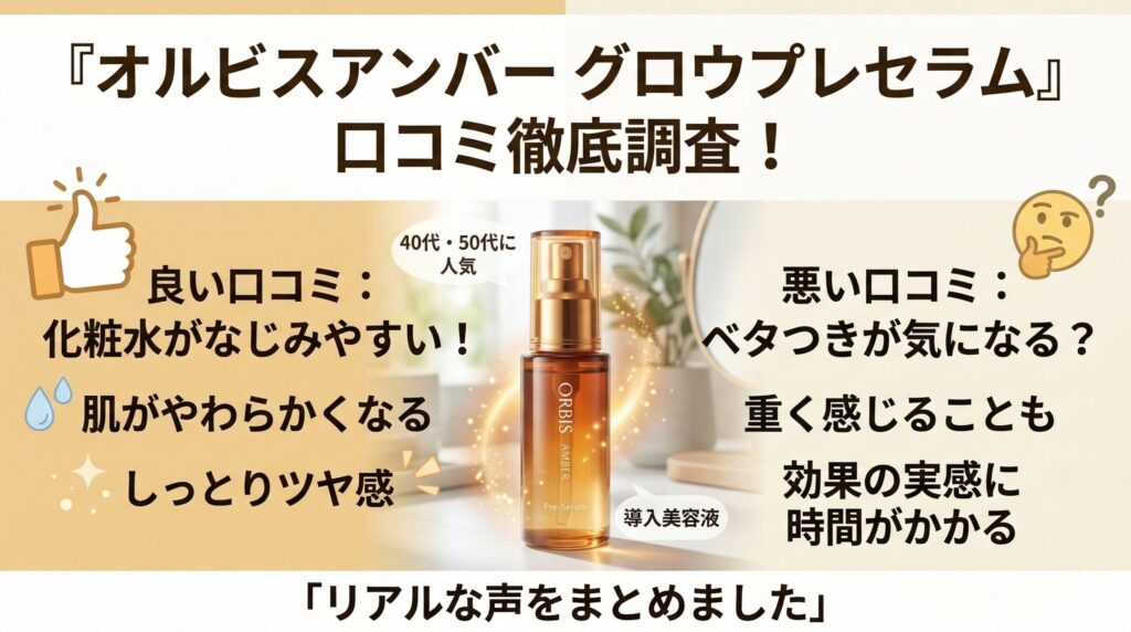 リード文 この記事では、オルビスアンバーグロウプレセラムの口コミをもとに、良い評判・悪い評判、そして年齢層までわかりやすく解説します。結論として、オルビスアンバーグロウプレセラムは40代・50代を中心に支持されている導入美容液で、「化粧水のな... -