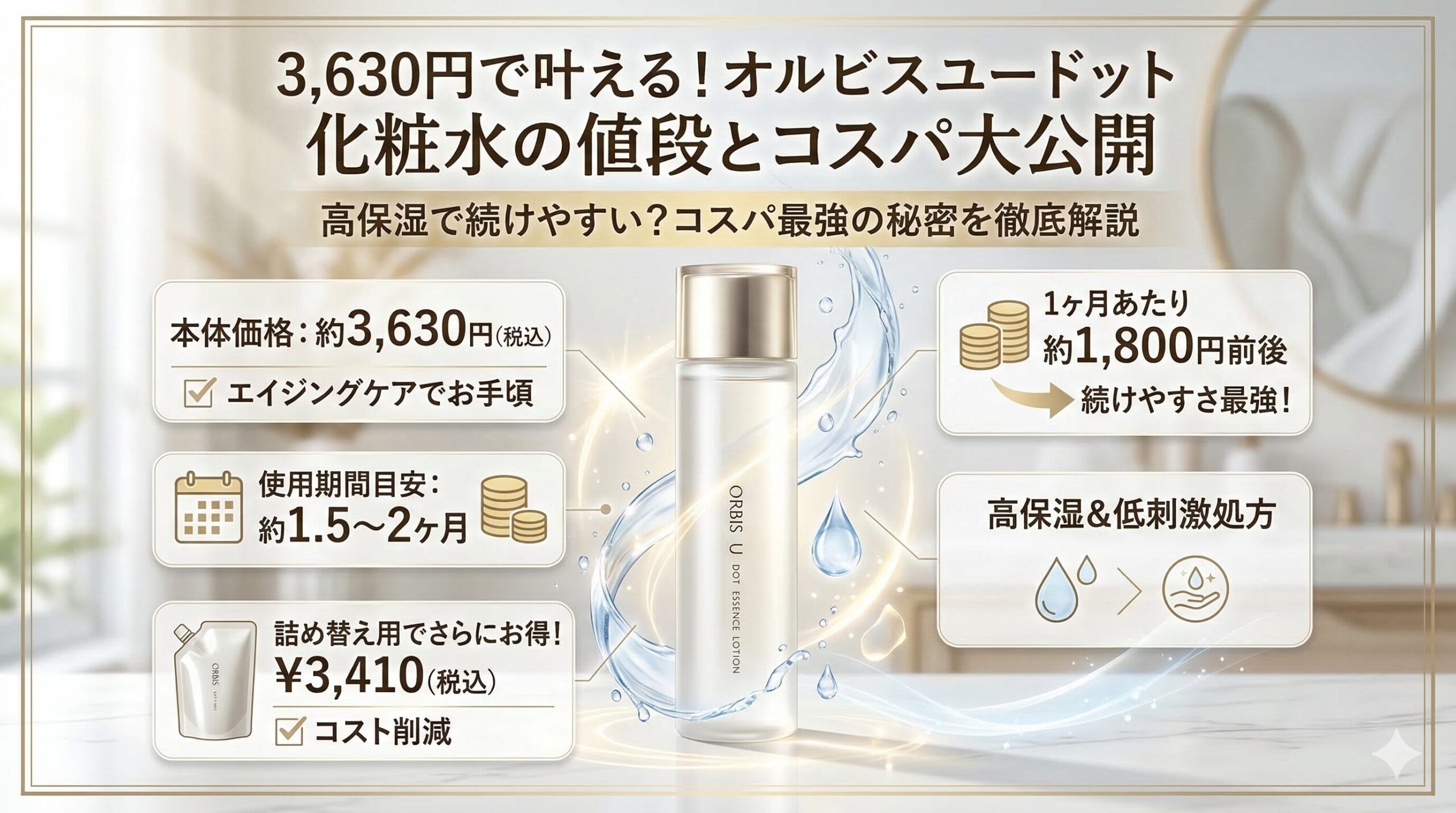 この記事では、オルビスユードット 化粧水の値段について詳しく解説します。結論から言うと、オルビスユードット 化粧水は約3,630円とエイジングケア化粧水の中では手頃な価格で、コスパの良さが魅力です。約1.5〜2ヶ月使えるため月あたりの負担も抑えやすく、継続しやすい点も評価されています。また、詰め替えを活用することでさらにコストを抑えることが可能です。この記事では本体と詰め替えの値段やコスパ、評価まで詳しく紹介するので、購入を検討している方はぜひ参考にしてください。