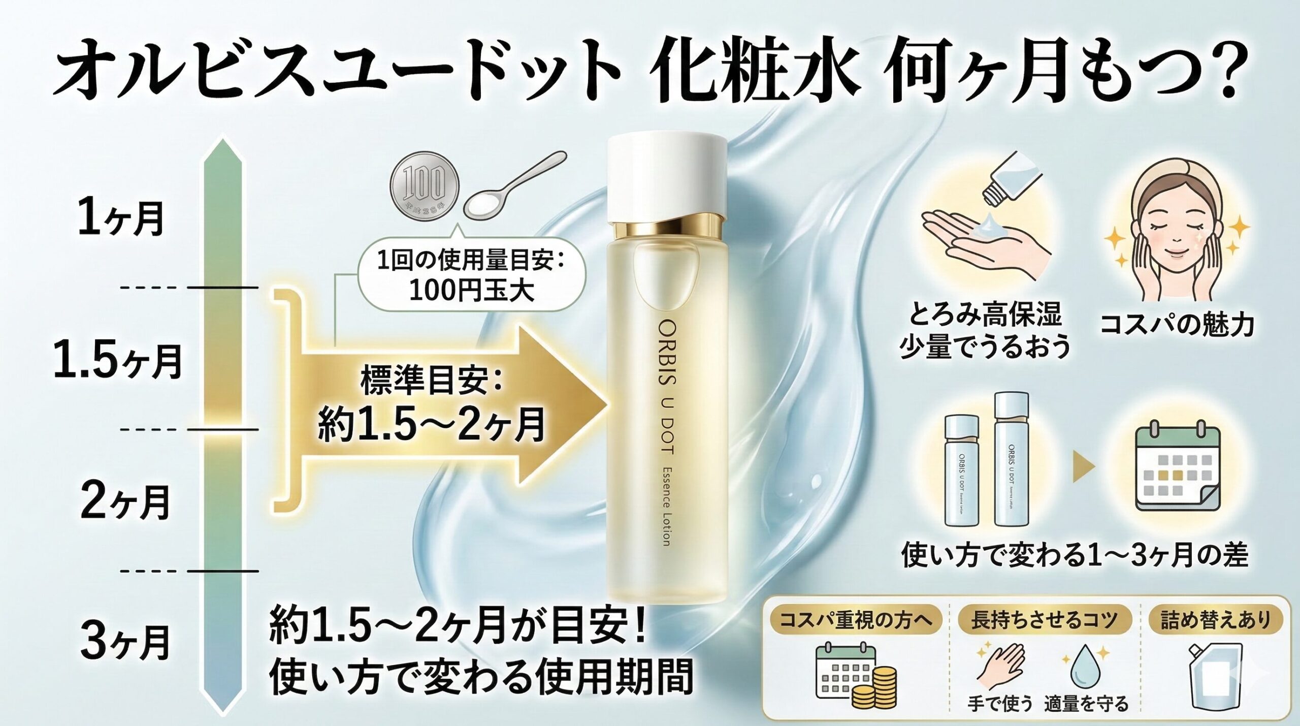 オルビスユードット 化粧水(エッセンスローション)は、180mlで約1.5〜2ヶ月が使用期間の目安です。朝晩のスキンケアで毎日使用した場合の一般的な期間で、多くのユーザーがこの範囲で使い切る傾向があります。